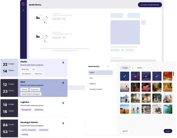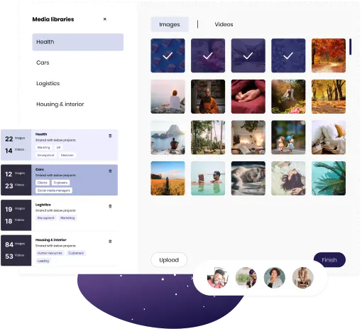 Create media libraries for your team and allow other members to effortlessly share their images and videos before posting content.